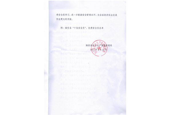 我司余志紅同志被表彰為海安縣優(yōu)秀安全員