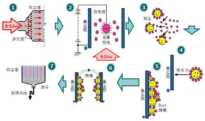 金屬放電線在直流高電壓的作用下①,將其周?chē)鷼怏w電離②,使粉塵或霧滴粒子表面荷電③,荷電粒子在電場(chǎng)力的作用下向收塵極運(yùn)動(dòng)④,并沉積在收塵極上⑤,水流從集塵板頂端流下,在集塵板上形成一層均勻穩(wěn)定的水膜⑥,將板上的顆粒帶走⑦。因此,濕式電除塵器與干式ESP的除塵原理基本相同,都要經(jīng)歷荷電、收集和清灰三個(gè)階段,區(qū)別在于清灰方式的不同,濕式電除塵器采用液體沖刷集塵極表面來(lái)進(jìn)行清灰。其工作原理如圖1。