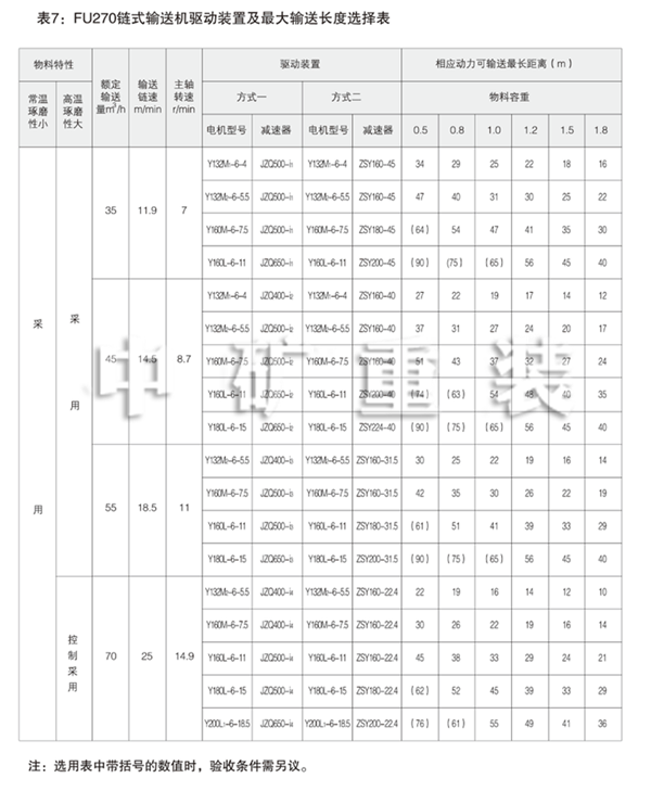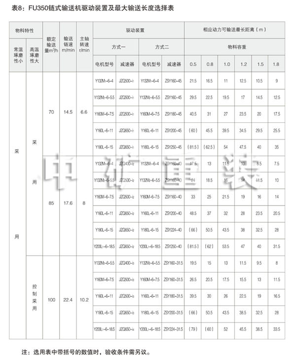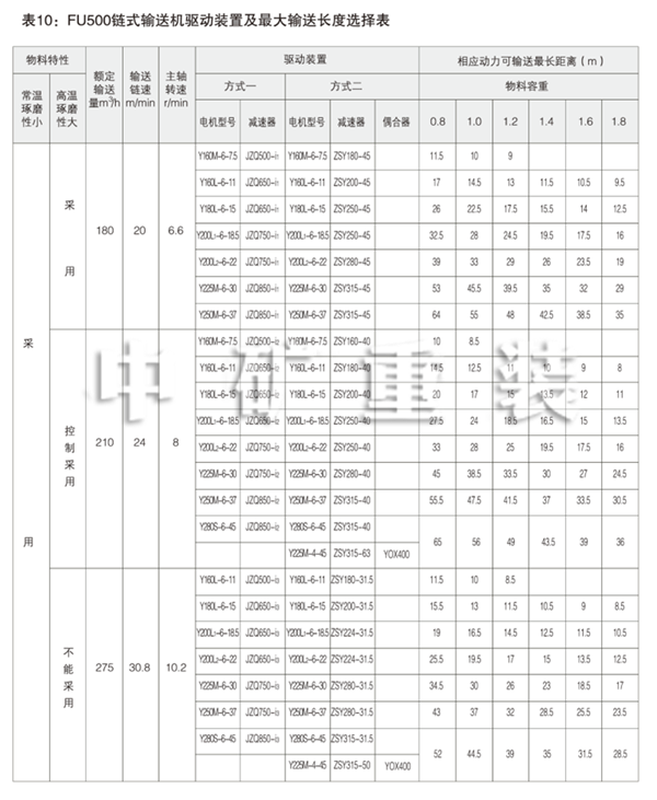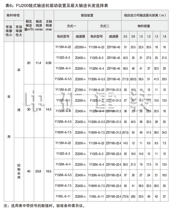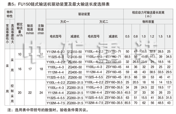 表5: FU150鏈?zhǔn)捷斔蜋C(jī)驅(qū)動(dòng)裝置及輸送長(zhǎng)度選擇表 Table 5: FU150 Chain Conveyor Drives and Max Conveying Distances