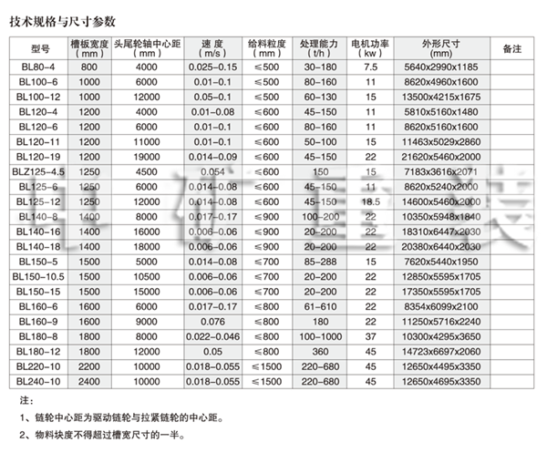 標(biāo)記示例:輸送播寬度B為1600mm,形式為L型,鏈輪中心距L為15m,右傳動方式的通用固定式中型板式給料機標(biāo)記為:板式給料機 BL1600-15 I JB/T4255—1999